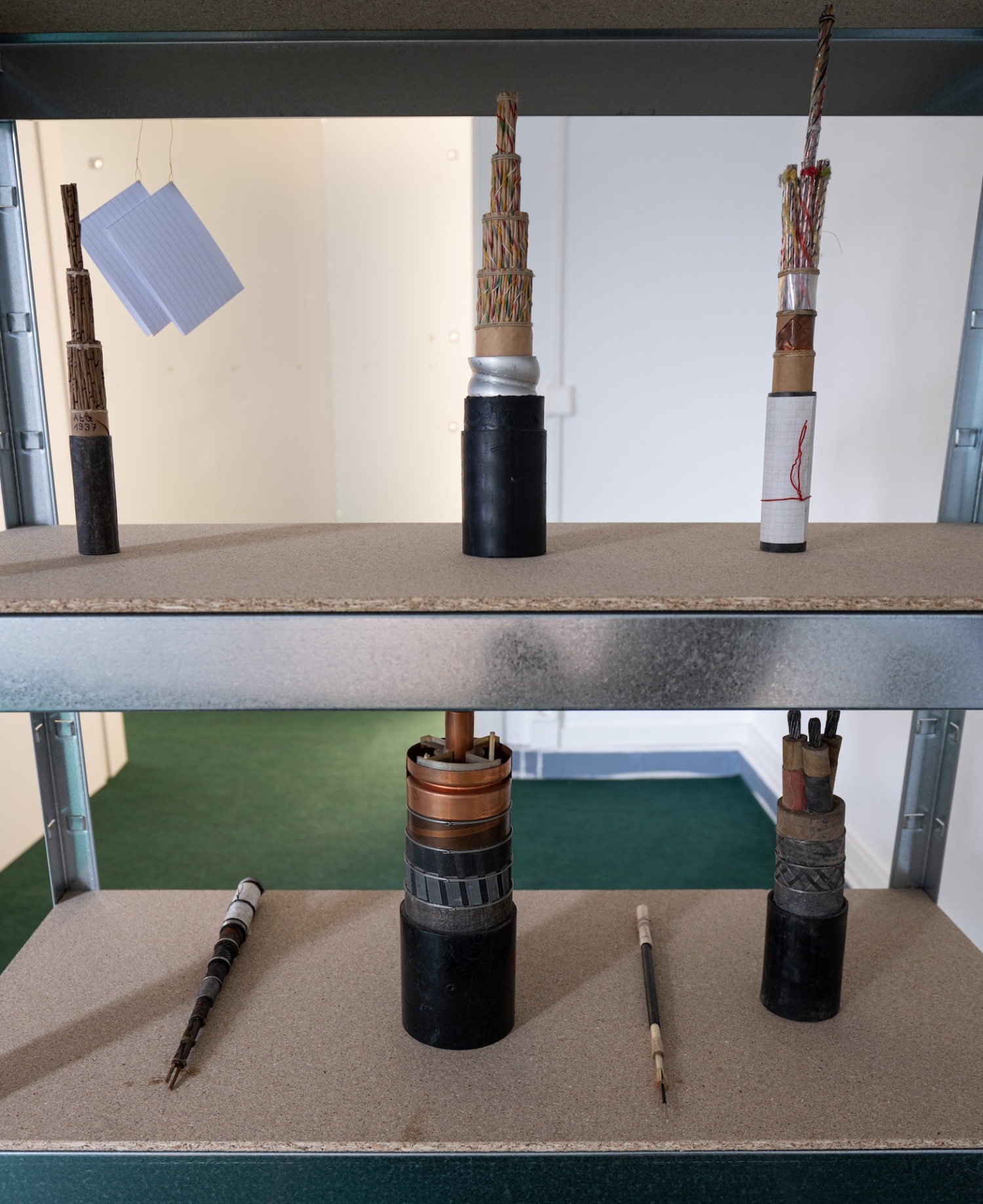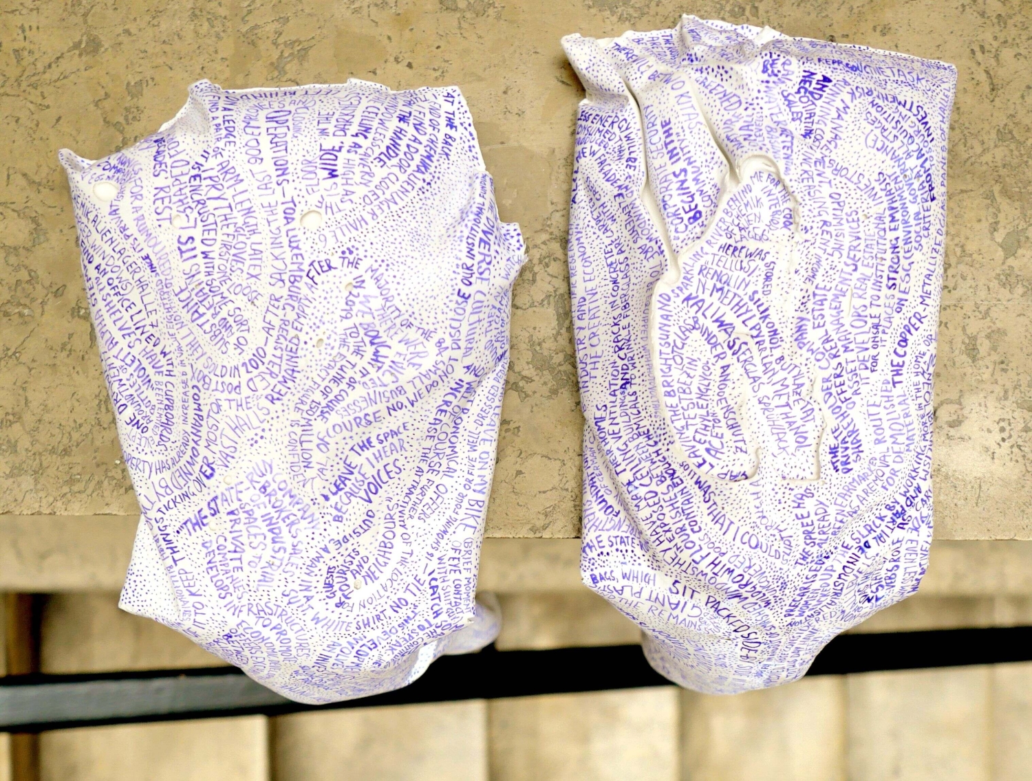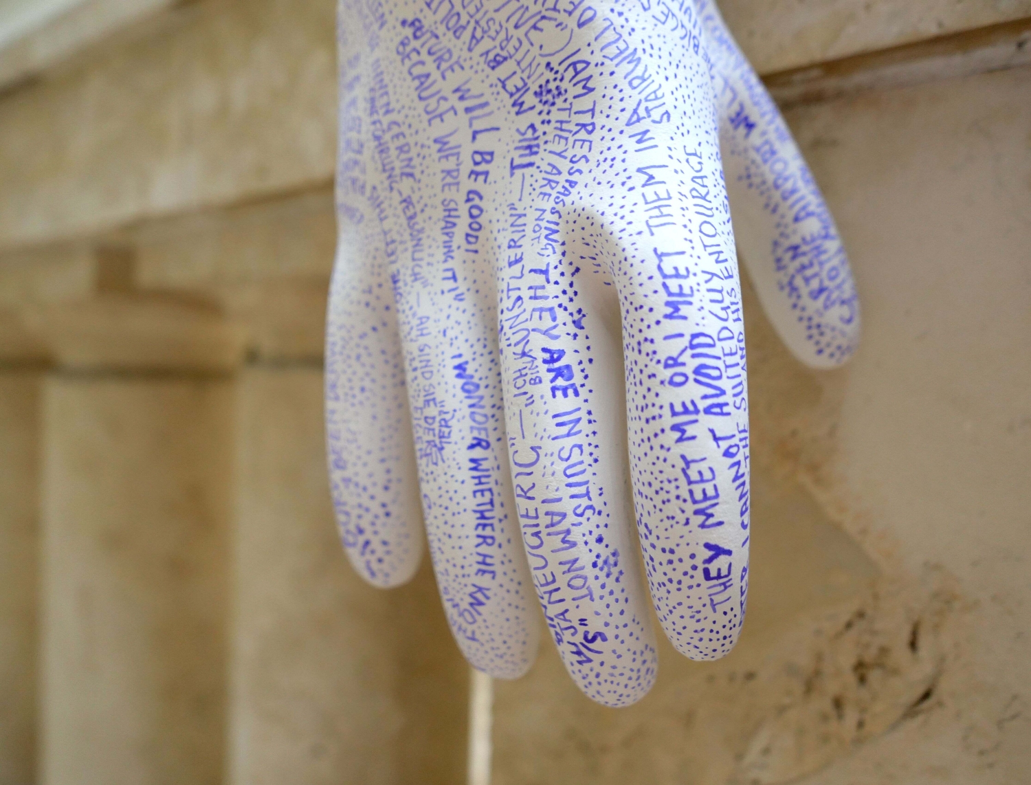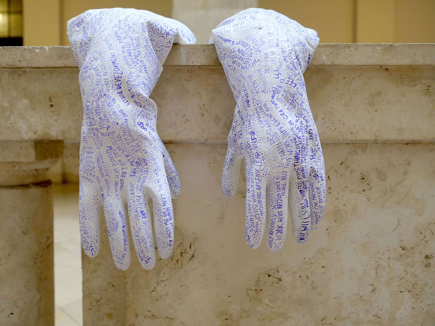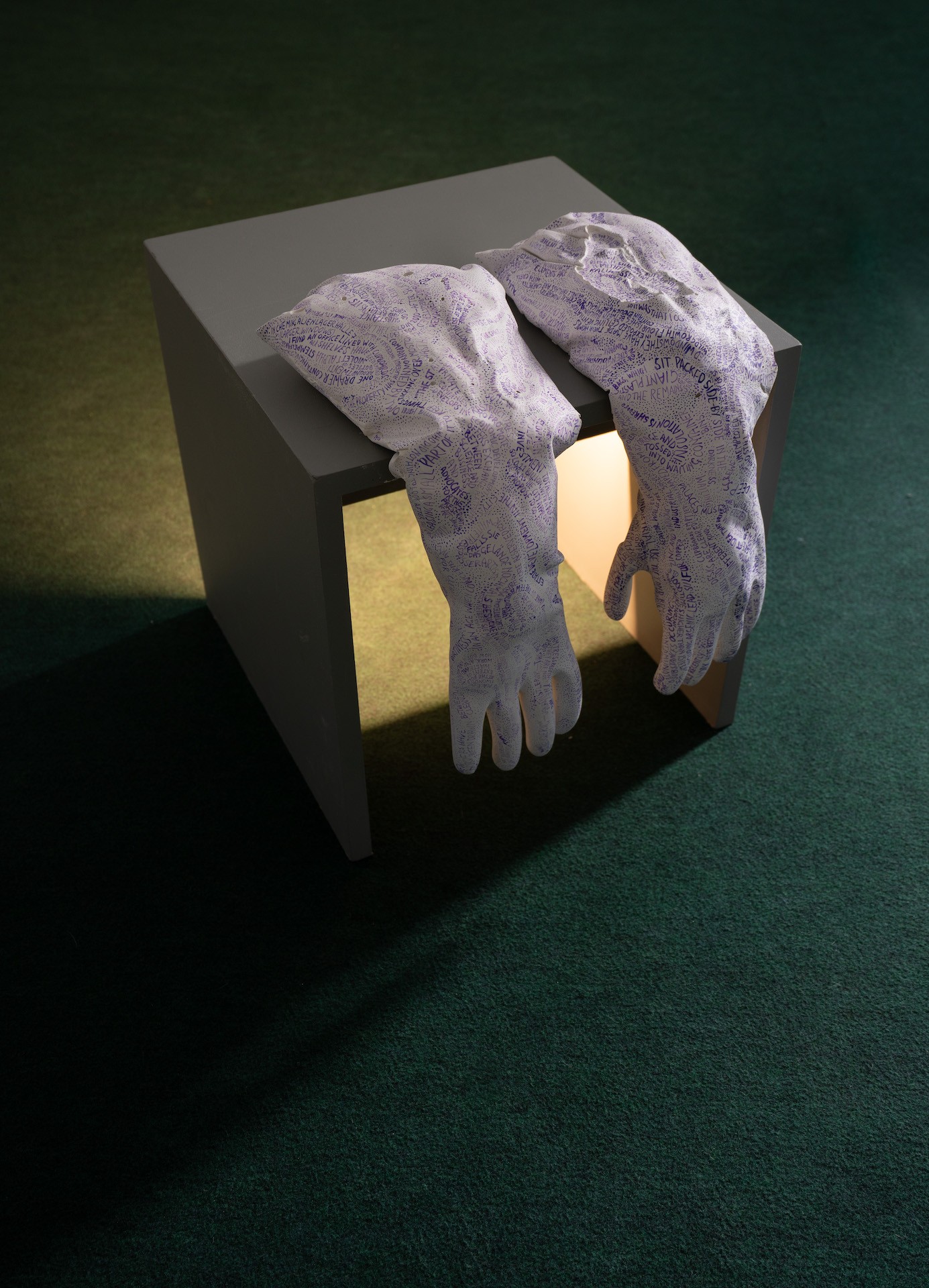 Gloves consists of a plaster cast made from arm-length latex safety gloves. These were found in an otherwise empty chemical storage hall on the former site of the ‘Werk für Fernsehelektronik’, previously the ‘Nationale Automobil-Gesellschaft’ factory, located in the Berlin district Oberschöneweide. Using violet stamp ink also found onsite, a handwritten text covers the entire surface of the cast. The text weaves together multiple stories relating to the place, tracing the experience of trespassing its spaces, and telling of an accidental meeting with its new real estate developer. The text also traces how, in this context, experiences of human displacement and the industrial contamination of the land are repressed during both the post-1990 ‘transition’ to capitalism and the ‘green transition’ today. Gloves points towards enduring toxicities that are still felt at the surface of the skin, even if stories and their spaces are to be erased.