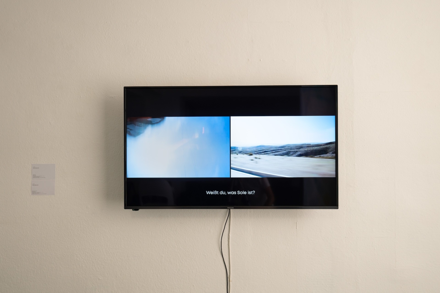 A flamingo patiently walks through the shallow water that collects on top of the Salina. Its long legs, furiously pink, zig-zag against the white background as it dips its head. Its tongue searches for the microscopic bodies of diatoms, creating ripples across the water, ruffling the sediment and turning the water bluer. Licking the entangled blue space stays on this moment and stretches it, dwelling in the encounter between the flamingo's otherworldly tongue and the microscopic ecology of the salt desert, wondering what kinds of pleasure arise from their touch. Is their encounter erotic? What if the flamingo's tongue is a gateway to another vocabulary of touch? What else is this encounter besides feeding? This work ponders on the possibilities that are lost when a landscape is judged in terms of its productivity; what are the openings, the futures, that are hidden away in the folds of the productive?